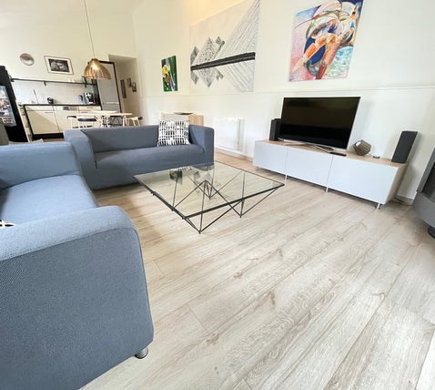- Zithoek met 2 zitbanken, TV, Houtkachel